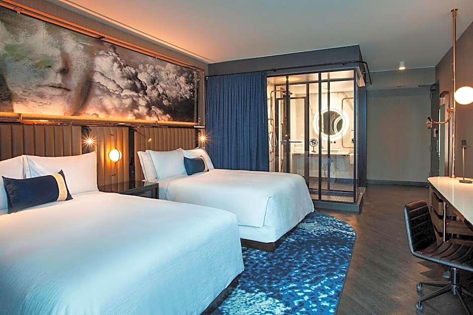 This room includes a cool action gel memory foam mattress and a private bathroom with a glass-enclosed walk-in shower, bathrobe, hairdryer and upscale bath amenities.